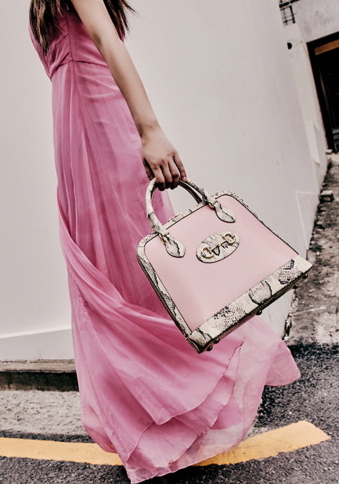 올오버 플리츠 디테일의 원 숄더 핑크 실크 드레스 8백80만원, 구찌 가옥에서 먼저 만나볼 수 있는, 파이톤 트리밍을 더한 핑크 컬러 구찌 홀스빗 1955 미디엄 톱 핸들 백 5백90만원 모두 구찌.