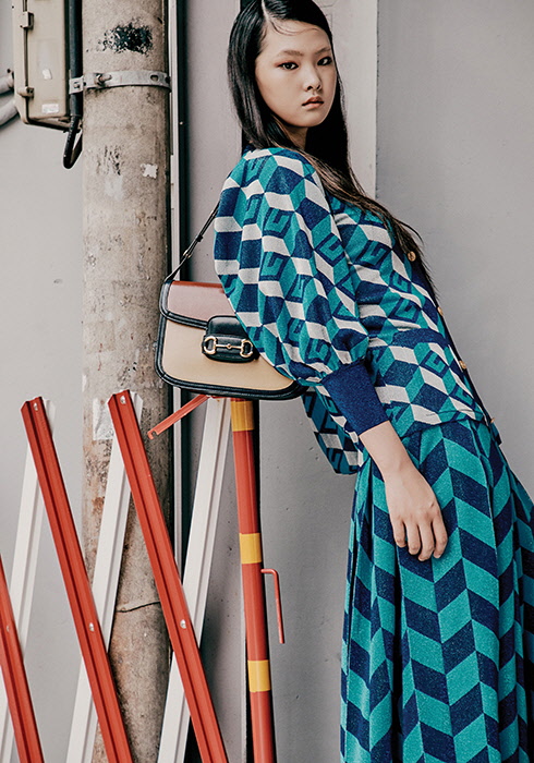 블루 플리츠스커트 2백40만원, 빈티지한 컬러 베리에이션이 돋보이는 구찌 홀스빗 1955 스몰 숄더백 3백90만원 모두 구찌. |