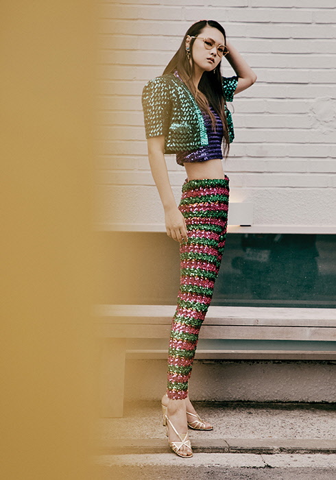 올오버 시퀸 임브로이더리를 더한 퍼플-멀티컬러 크롭트 톱 1백80만원, 그린-멀티컬러 크롭트 카디건 3백70만원, 그린-핑크 멀티컬러 팬츠 3백60만원, 더블 G 디테일의 골드 메탈릭 레더 미드힐 샌들 1백15만원, 골드 메탈 라운드 프레임 아이웨어 58만원, 플라워와 크로스 모티브의 메탈 이어링 62만원 모두 구찌.