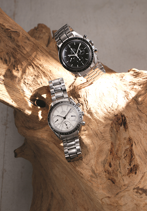 (왼쪽부터) 오메가 스피드마스터 컬렉션 오팔 실버 다이얼을 보호하는 강력한 사파이어 크리스털 글라스와 무광 블랙 알루미늄 타키미터 링, 40mm 사이즈의 스테인리스 스틸 케이스를 장착한 ‘레이싱 코-액시얼 크로노그래프’ 5백만원대. 블랙 다이얼을 보호하는 헤잘라이트 크리스털, 스몰 세컨즈 서브 다이얼, 30분 카운터와 12시간 카운터, 42mm 사이즈의 스테인리스 스틸 케이스를 매치한 ‘스피드마스터 문워치 프로페셔널 크로로그래프’ 6백만원대. 문의 02-2118-6212