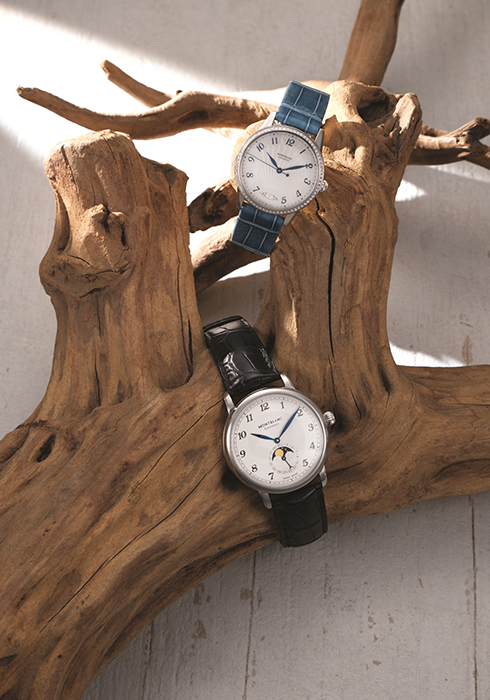 (위부터) 몽블랑 보헴 오토매틱 데이트 자개 다이얼, 기요셰 패턴, 블루 플로럴 아라비아숫자 인덱스로 우아함을 더한 34mm 스테인리스 스틸 케이스의 앨리게이터 가죽 스트랩 워치 6백40만원. 몽블랑 스타 레거시 문페이즈 29일 12시간 44분 3초를 주기로 초승달, 보름달, 반달, 상현달, 하현달로 바뀌는 달의 모습을 문페이즈를 통해 볼 수 있는 42mm 라운드 스테인리스 스틸 케이스 워치 5백28만원. 문의 1670-4810