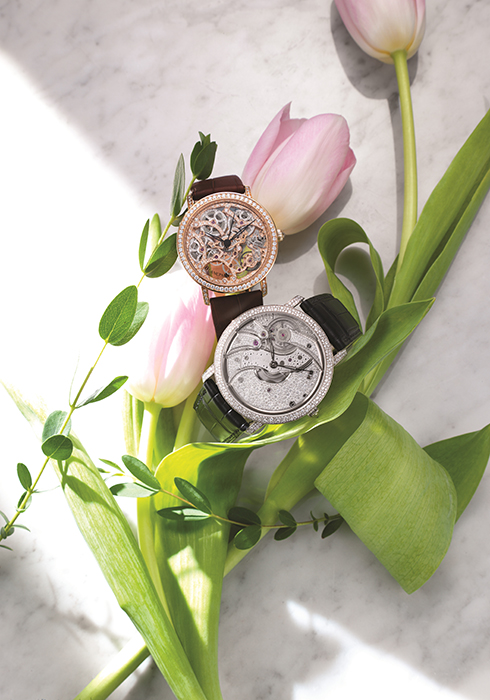 (왼쪽부터) 예거 르쿨트르 랑데부 문 아름다운 자개 디스크를 통해 보름달에서 반달, 초승달로 변화하는 신비한 달의 모습을 볼 수 있는 39mm 화이트 골드 케이스 워치 가격 미정. 예거 르쿨트르 랑데부 나잇 & 데이 실크의 부드러운 감촉을 떠올리게 하는 기요셰 패턴으로 장식한 숫자와 플로럴 핸즈, 다이아몬드를 섬세하게 세팅한 베젤이 우아한 멋을 전하는 앨리게이터 가죽 스트랩 워치 가격 미정. 문의 02-6905-3998