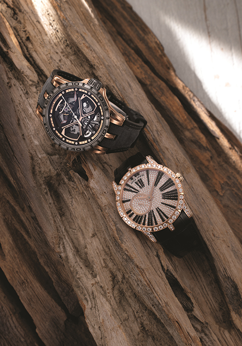 (위부터) 로저드뷔 엑스칼리버 우라칸 45mm 핑크 골드 & 티타늄 스켈레톤 케이스, 블랙 러버로 오버 몰딩한 티타늄 컨테이너, 티타늄 플루티드 베젤, 휠 너트 디자인의 티타늄 크라운, 무반사 처리한 사파이어 크리스털 글라스 등 모든 디테일에서 강력하고 굳건한 에너지를 느낄 수 있는 오픈워크 다이얼 워치 8천4백만원. 로저드뷔 엑스칼리버 42 마이크로 로터 오토매틱 다이아몬드를 풀 파베 세팅한 케이스와 다이얼로 정교함에 화려함을 더한 42mm 라운드 핑크 골드 케이스 워치 가격 미정. 문의 02-3479-1403