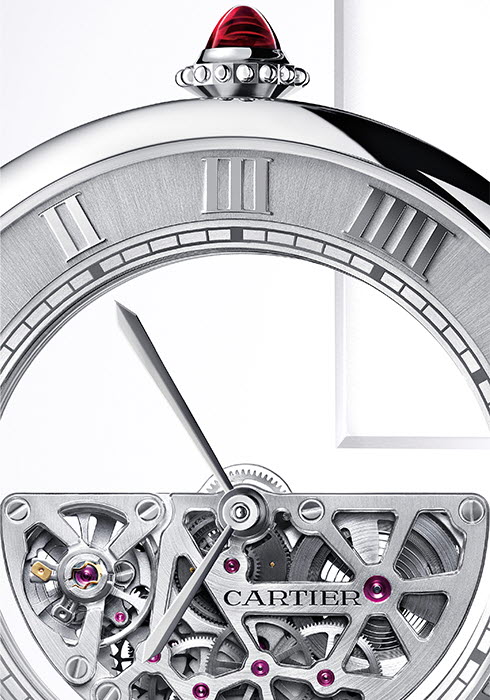 시곗바늘이 허공에 떠 있는 듯한 장면을 연출하는 수수께끼 같은 이 워치는 메종의 역사에서 독립된 장을 이루는 ‘미스터리 클락’ 기술을 스토리의 중심으로 삼는다. 핸즈가 무브먼트 어디에도 연결되지 않고 마치 클락의 투명한 몸체 위를 떠다니는 것처럼 보이기 때문에 ‘미스터리’라고 불리며, 루이 까르띠에와 워치메이커 모리스 쿠에(Maurice Couet)의 공동 개발로 탄생했다. 핸즈를 무브먼트에 직접 연결하는 것이 아니라, 가장자리 톱니 모양 금속에 부착된 2장의 크리스털 디스크에 고정하는 방식이다. 클락 하단 받침대 속에 설치된 무브먼트가 작동하면, 2장의 크리스털 디스크가 하나는 분의 속도로, 다른 하나는 시의 속도로 돌아가면서 핸즈를 움직이는 원리. 디스크 가장자리는 시를 표시하는 원형 트랙으로 숨겨져 핸즈가 완벽하게 허공에 떠 있는 듯 매력적인 장면을 연출한다. 또 다이얼 중앙을 비우고 칼리버를 과감하게 전면에 드러냈다는 점에서 까르띠에만의 독보적인 수준의 엔지니어링 기술을 엿볼 수 있다. 시계 기술의 극치라 불리는 스켈레톤 타입으로 완벽에 도전하는 칼리버 9801 MC의 복잡 정교한 메커니즘의 역동적인 움직임을 감상할 수 있다.