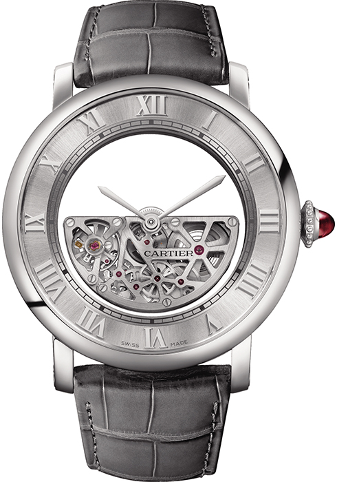 탁월한 기술력으로 구현한 정교함은 미학을 통해 완성되기 마련. 오픈워크 다이얼 위 반원형 스켈레톤 무브먼트는 결코 혼잡함으로 시선을 끌지 않는다. 무브먼트는 시계 구동에 필요한 최소한의 부분만 남기고 모두 깎아냈으며, 브리지는 정교하게 세공해 우아한 곡선미를 살렸다. 또 각각 브리지 사이에 세팅한 7개의 인조 루비는 마치 보석처럼 반짝인다. 높은 안정성과 정확성을 보장하며 최대 42시간의 파워 리저브를 지원하는 까르띠에 매뉴팩처 오토매틱 와인딩 메캐니컬 무브먼트 9801 MC로 움직이며, 블랙 및 다크 그레이 세미-매트 앨리게이터 가죽 스트랩을 매치해 하이엔드의 품격을 완성한다. 메종의 상징 중 하나인 카보숑 컷 크라운으로 정체성을 이어가며, 고유 번호를 부여해 30피스 한정 출시한다.