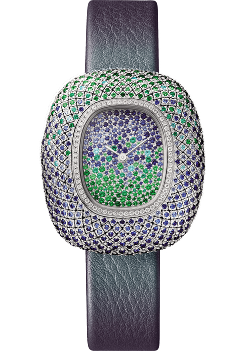새로운 영역을 탐닉하고 메종의 키워드를 끊임없이 재해석해 선보이는 꾸쌍 드 까르띠에 워치는 찬란히 빛나는 이브닝 타임을 위해 고안되었다. 선레이 기법으로 마감한 관능적인 다이얼에 검 모양 블루 핸즈와 고전적인 로마자 인덱스 등 메종 특유의 요소로 미감을 채운 버전과 인덱스를 과감하게 없애고 리미티드 에디션으로 선보이는 젬 풀 세팅 버전이 라인업을 이끌며 하이엔드의 품격을 드러낸다. 메종의 주얼리 아틀리에는 전통적인 그레인 세팅을 사용하지 않고, 케이스 안에 다이아몬드를 직접 세팅해 통합하는 트라이앵글 세팅을 선택했다. 그레인 요소가 제외된 이러한 시각적 효과는 스톤 고유의 아름다움을 더욱 강조하고 광채를 극대화한다. 서로 교차하며 격자무늬를 만들어내는 골드 링크를 워치 안 요소로 통합한 점도 혁신적이다. 덕분에 케이스는 기존과 다른 형태로 변형할 수 있음과 동시에 되돌릴 수도 있다. 다채로운 크기와 컬러의 스톤을 활용하기 때문에 워치는 훨씬 어려운 제작 과정을 거쳐 탄생한다. 유연함을 지닌 시계라는 사실 자체만으로 제작에 훨씬 더 복잡함을 야기하기에 워치메이커는 이를 레진으로 봉인하는 등 제작에 더 많은 시간과 섬세한 마감 기술로 이를 구현했다. 메종의 장인이 선보이는 혁신적이고 정교한 전문 세팅 기법을 통해 강렬한 텍스처가 살아난 이 개성 넘치는 주얼리 워치는 다채로운 스톤 세팅으로 라인업을 구성한다. 다이아몬드와 블랙 스피넬, 파라이바 투르말린과 차보라이트로 이뤄진 파빌리온이 장식적인 요소의 스터드가 되어 남다른 오라를 풍긴다.
