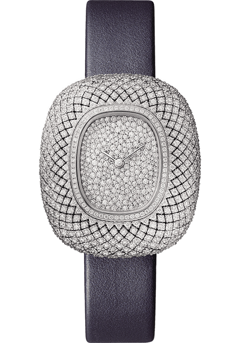 2004년 첫선을 보인 이후 절제되고 세련된 워치메이킹 미학으로 차별화된 매력을 선사해온 패트리모니 컬렉션. 이번 새로운 모델은 색다른 비율과 컬러로 재해석되어 또 다른 매력을 전한다. 직경 36.5mm 케이스에 새롭게 디자인한 돔형 다이얼의 곡선이 돋보인다. 다이얼의 컬러감이 독특한데, 밝은 중앙에서부터 가장자리로 갈수록 더 깊어지는 그러데이션이 매력을 배가한다. 아워 마커 사이의 미닛 트랙에는 48개의 라운드 컷 다이아몬드를 세팅했으며, 6시 방향 날짜 디스크에서 정교함을 확인할 수 있다. 화이트 골드에 블루 다이얼과 스트랩 버전, 핑크 골드에 핑크 다이얼과 스트랩 버전으로 나뉘며 베젤에 72개의 라운드 컷 다이아몬드를 세팅한 버전까지 총 4개의 피스로 만나볼 수 있다.