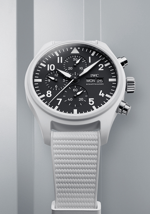 세라타늄은 스크래치에 강한 세라믹의 장점과 가볍고 견고한 티타늄의 장점을 결합한 것으로, IWC는 장장 5년간의 연구 개발을 통해 이 소재를 완성했다. 세라타늄의 특성 중 하나는 고유의 희미한 광택을 띠면서 블랙에 가까운 짙은 컬러를 내는 소재적 특징으로, 그 자체로 세련된 IWC 블랙 컬러를 완성한다. 이를 통해 고급스러우면서도 절대 벗겨지지 않는 단단한 내구성까지 갖출 수 있었던 것. 41mm 케이스에 크라운과 크로노그래프 푸셔, 스트랩 버클까지 세라타늄을 사용해 통일감을 주었으며, 블랙 러버 스트랩으로 스포티함을 부여했다. 46시간의 파워 리저브를 지원하는 크로노그래프 칼리버 69385로 구동한다.