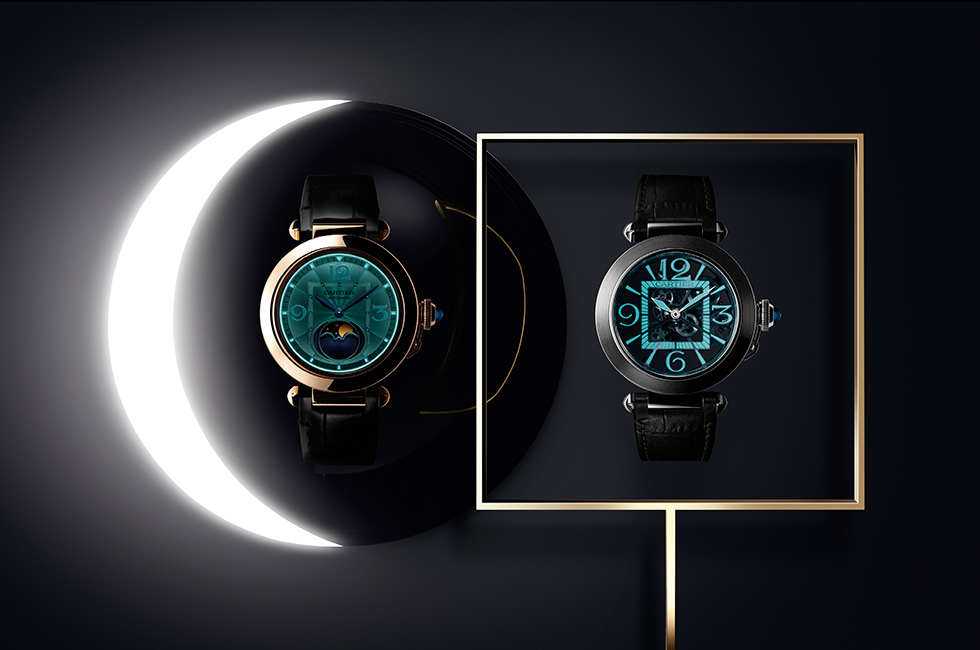 스켈레톤 버전은 메인 플레이트와 브리지를 최소한으로 줄인 풀 스켈레톤 버전으로 선보인다. 메종의 상징적인 스켈레톤 무브먼트인 9624 MC 칼리버를 탑재했으며, 파샤 드 까르띠에 워치의 아라비아숫자를 인덱스에 적용해 정체성을 잇는다. 4개의 오버사이즈 숫자부터 다이얼의 원형 안 사각형에 이르기까지 전통을 거부하는 파샤 드 까르띠에 워치의 과감한 사이즈와 디자인이 강렬함을 더욱 강조한다. 바게트 컷 다이아몬드를 파베 세팅한 리미티드 에디션 화이트 골드 주얼리 버전과 케이스에 블랙 ADLC, 브리지와 핸즈에 슈퍼루미노바 처리해 어둠 속에서도 명확한 빛을 발하는 스틸 버전, 두 가지로 구성한다.