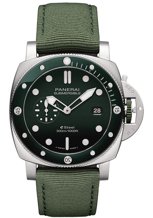파네라이 섭머저블 쿼란타콰트로 e스틸™은 파네라이만의 디자인 코드와 기술적 완성도는 그대로 유지하면서도 지속 가능성이라는 목표의 중요성을 인식한 모델이다. 소재 중 72g은 재활용 소재로 만들었으며, 적용한 e스틸 소재는 물리적 구조, 내부식성 등 그 물성이 일반적인 스틸 소재와 같다. 하우스를 대표하는 P.900 칼리버를 탑재했으며, 마찬가지로 수심 300m 방수 기능과 3일간의 파워 리저브를 지원한다. 기본 스트랩은 재활용 페트 소재로 만든 패브릭 스트랩과 교체용으로 재활용 러버 소재를 함께 제공한다. 각 모델에는 스트랩 교체용 공구와 버클 분리용 드라이버가 포함된다. 문의 02-6905-3394