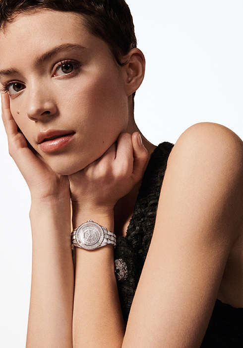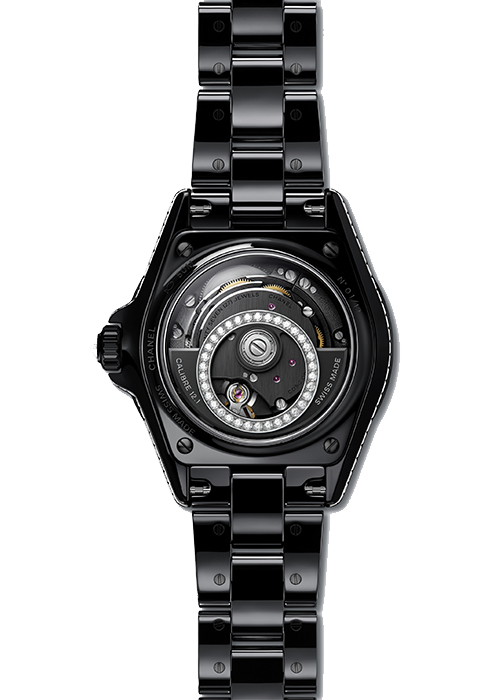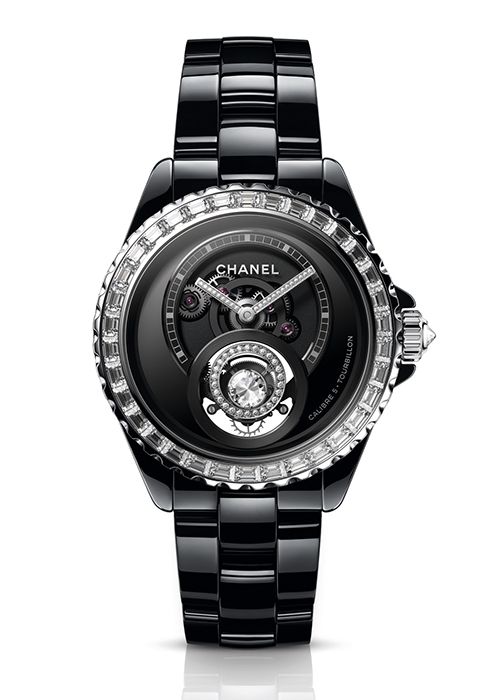 이번 샤넬의 J12 워치 중 가장 주목할 만한 기술력과 제품이 바로 다이아몬드 뚜르비옹 칼리버 5다. 샤넬 워치의 첫 인하우스 플라잉 투르비용 무브먼트로 앞은 물론 케이스 백까지 섬세하게 마감한 노출 메커니즘에 샤넬 오트 오를로제리 매뉴팩처 무브먼트의 시그너처인 사자 머리로 웅장함을 더했다. 특히 주목할 점은 플라잉 투르비용 케이지 중앙에 올린 솔리테어 다이아몬드. 정확한 커팅 기술로 광채를 극대화한 이 다이아몬드는 초의 리듬에 맞춰 움직인다. 매트 블랙 세라믹에 스틸 또는 유광 블랙 세라믹, 18K 화이트 골드 소재로 만나볼 수 있으며, 각 모델은 55개 한정판으로 제작한다.