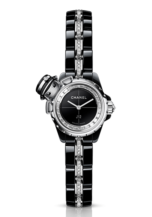 견고한 블랙 세라믹에 18K 화이트 골드를 매치해 케이스와 브레이슬릿을 구성했다. 블랙 래커 다이얼에 플랜지에만 바게트 컷 다이아몬드 24개(약 0.48캐럿)를 세팅했으며 브레이슬릿의 가운데엔 브릴리언트 컷 다이아몬드 1백16개(약 1캐럿)를 세팅해 은은한 우아함을 부여했다. 키포인트는 케이스에 장난스럽게 매달린 마드모아젤 샤넬 캐릭터. 화이트 골드와 블랙 래커 소재 장식으로 표현했으며, 브릴리언트 컷 다이아몬드로 강조한 투톤 스트로 햇을 얹었다.