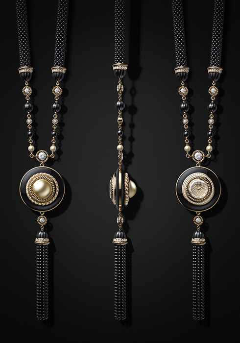 샤넬의 패션감각과 워치 메이킹 기술이 만난 마드모아젤 프리베 코로만델 롱 네크리스는 18K 베이지 골드로 만든 미니어처로 장식한 오닉스 다이얼에 브릴리언트 컷 다이아몬드 50개를 세팅했다. 오닉스 다이얼의 뒷면에는 18K 골드로 가브리엘 샤넬의 옆모습을 조각했다. 이 롱 네크리스는 주얼리 워치로서 하나의 아트피스 같은 섬세한 디테일을 보여준다.