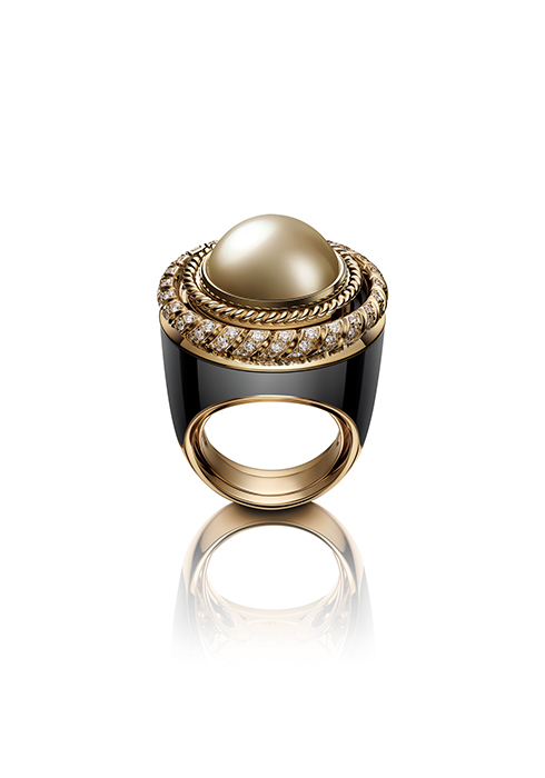 샤넬의 주얼리 워치 세트. 올해 출시한 세 가지 액세서리로 구성된 주얼리 워치는 골드 펄을 중심으로 디자인해 고급스러움과 우아함을 담았다. 반구 형태의 진주를 세팅한 버튼 모티브로 롱 네크리스부터 링, 단단한 커프 브레이슬릿을 장식했다. 전부 5개의 한정판으로 제작되었다.