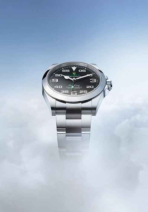 크라운 가드와 직선형 측면을 갖춘 완전히 새롭게 디자인된 케이스가 특징인 차세대 오이스터 퍼페츄얼 에어-킹. 최초로 오이스터록 세이프티 클래스프를 장착했으며 분 눈금 5 앞에 0을 추가해 디스플레이도 더 균형 있게 재배치했다. 가독성을 위해 크로마라이트 디스플레이를 최적화했으며, 시곗바늘과 12시 방향의 삼각형 시각 표식은 강렬한 푸른빛이 더 오래 지속되는 신소재의 야광으로 채웠다. 워치메이킹 기술의 정점을 보여주는 무브먼트인 칼리버 3230으로 구동하며 일상적인 착용에서 최상의 성능을 보장하는 최상급 크로노미터 인증을 받았다. 세련된 블랙 다이얼과 스틸 브레이슬릿의 조화가 인상적.