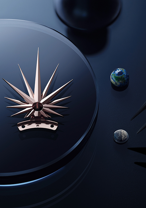 이번 마쓰 미스터리어스를 통해 선보이는 크리에이션에서는 ‘로터’가 진정한 요소로 부상해 워치메이킹 영역에서 새로운 변화를 이끈다. 매뉴팩처에서 장장 8년간의 연구 끝에 탄생한 칼리버 9801 MC가 바로 그 주인공. 혁신적인 원리를 적용한 이 칼리버는 시계의 정확성을 방해하는 요소인 중력의 영향을 거의 받지 않도록 설계되었다. 이를 위해 밸런스 휠이 언제든 동일하게 수직적 위치를 유지할 수 있도록 고안했고, 로터는 불규칙한 속도로 양방향 회전한다.