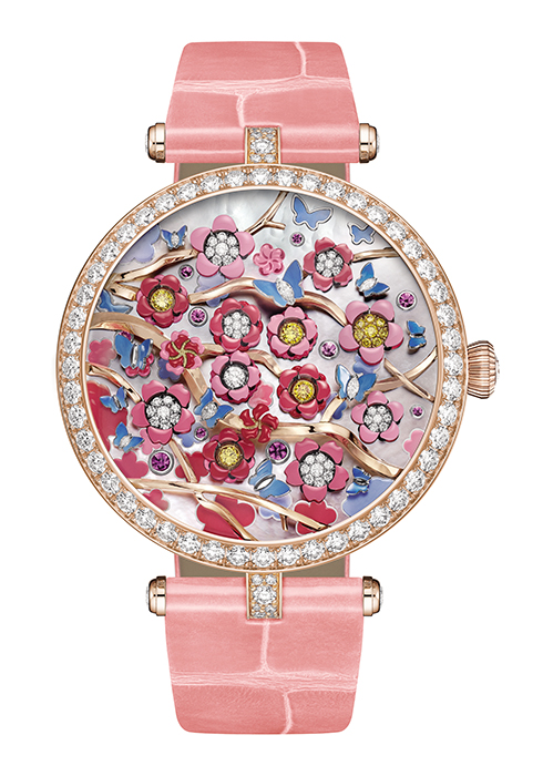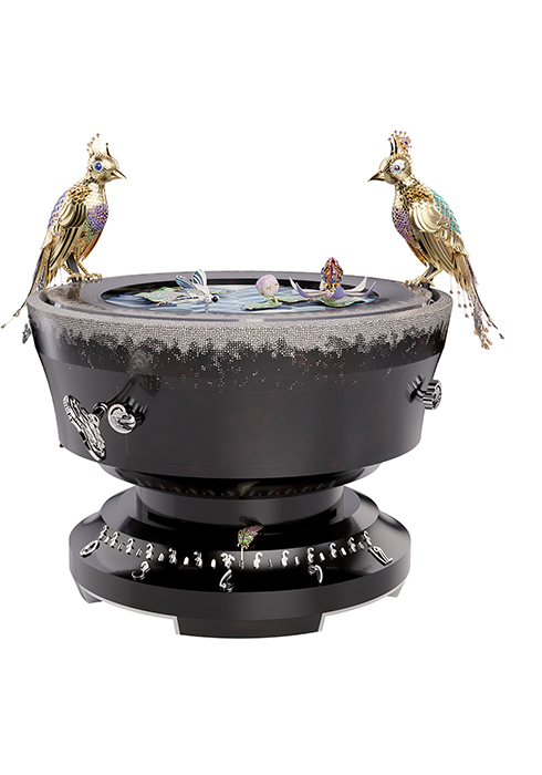 워치라기보다 하나의 오브제이자 아트피스 같은 비주얼의 이 타임피스는 온 디멘드 애니메이션과 레트로그레이드 타임 디스플레이가 결합된 제품이다. 높이 44.15cm, 너비 41.13cm의 돔형 케이스 안에는 장식용 스톤 50개로 구성해 변화하는 파도의 다채로운 색상과 반투명하게 반짝이는 광채를 표현한 연못이 자리한다. 그 위에 특별한 기술로 만든 에나멜로 구현한 옅은 핑크와 보라색 꽃잎, 오묘한 녹색으로 입체적으로 표현한 잎이 자리한다. 그와 함께 화이트 골드와 다이아몬드 세팅으로 섬세하게 완성한 잠자리까지 위치해 자연을 디테일하고 실감 나게 묘사했다. 워치의 몸통 위에 자리 잡은 한 쌍의 새는 옐로 골드에 블루 및 퍼플 사파이어, 에메랄드, 차보라이트 가닛 등 다양한 원석으로 살아 움직이는 듯 정교하게 표현해 반클리프 아펠 메종의 예술적 장인 정신을 보여준다. 시간을 표시하는 방식은 베이스 측면에 배치한 깃털의 점진적 움직임과 12시가 되면 다시 시작 지점으로 돌아가는 식으로 진행된다. 최대 5회 연속으로 작동되며 약 1분 동안 오토마통이 작동해 낭만적인 장면을 선보인다. 메캐니컬 무브먼트로 작동하며 8일간의 파워 리저브를 제공한다. 문의 1668-1906