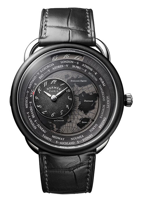 1978년 앙리 도리니가 디자인한 아쏘 워치는 여행에 대한 에르메스의 세계관과 스타일을 담았다. 플래티넘 티타늄 또는 스틸 소재의 비대칭 러그가 특징인 원형 케이스에는 도시 인디케이터를 장착한 세컨드 타임존이 있으며 중앙에 돌아가는 위성이 도시에서 도시를 넘나들며 세계 시간을 한눈에 확인시켜준다. 41mm의 플래티넘 케이스에 매트 블랙 DLC 코팅한 티타늄 베젤 버전과 38mm 스틸 케이스 버전이 있다. 에르메스 스트랩 공방에서 직접 생산하는 악어 또는 부드러운 송아지가죽 스트랩은 강렬한 딥 블랙 혹은 블루 다이얼과 조화를 이루며 여행자의 신비로운 매력과 클래식함의 정수를 표현한다.