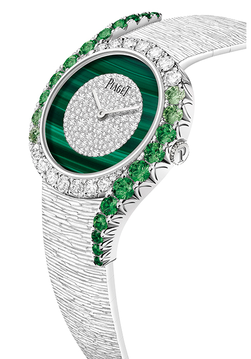 브랜드의 아이코닉 워치인 라임라이트 갈라 하이 주얼리 워치. 올해는 더욱 빛나는 디자인과 다채로운 다이아몬드 컷의 조합으로 화려함을 표현했다. 피아제의 시그너처 디자인인 비대칭 베젤에 컬러풀한 차보라이트와 다이아몬드로 그러데이션 세팅해 눈길을 사로잡으며, 우아한 녹색의 말라카이트 다이얼에 스노 세팅한 다이아몬드로 매력을 배가했다. 지름 32mm 화이트 골드 케이스에 마치 오트 쿠튀르 드레스의 패브릭처럼 보이는 팰리스 데코 브레이슬릿을 매치해 스타일리시함을 추가했다. 매뉴팩처 오토매틱 무브먼트 501P1로 구동되며 사파이어 케이스 백을 통해 무브먼트를 감상할 수 있다. 문의 1668-1874