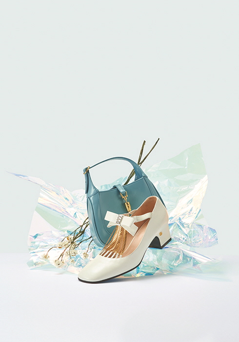 1960~70년대 구찌를 상징하던 재키 백이 보다 앙증맞은 모습으로 부활했다. 아이코닉한 피스톤 클로저를 단 하늘색 재키 1961 호보 미니 백 2백16만원, 체인과 크리스털 보 장식 메리제인 펌프스 1백70만원 모두 구찌. 문의 1577-1921