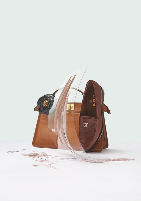 하우스를 상징하는 카멜리아 모티브 레더 브로치, 어퍼의 심플한 금장 로고 장식 하나만으로 힘을 준 미니멀한 카프 스킨 소재 로퍼 모두 가격 미정 샤넬. 문의 080-200-2700, chanel.com