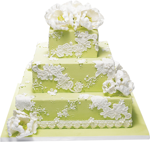 웨딩 케이크는 전체적인 웨딩 파티 테이블 콘셉트와 칵테일 드레스 컬러를 고려해서 준비하면 훨씬 센스 있어 보인다. 그린 컬러의 플라워 케이크는 윤시케이크. 문의 www.yoonsicakes.com.