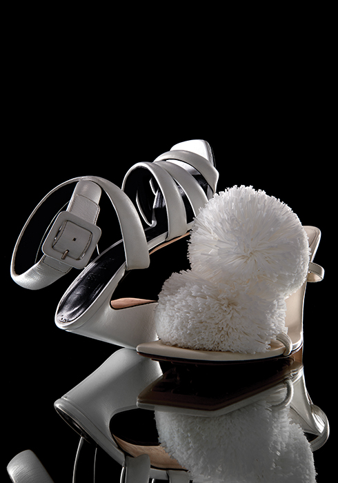 유니크한 곡선 힐이 눈길을 사로잡으며, 두꺼운 스트랩이 매력을 더하는 트리플 앵클 샌들 1백3만원 세르지오 로시. 문의 0507-1373-5977. 라피아 폼폼 디테일이 걸을 때 마다 경쾌한 무드를 배가하는 램 스킨 소재의 아담 레이스업 샌들 가격 미정 보테가 베네타. 문의 02-3438-7682