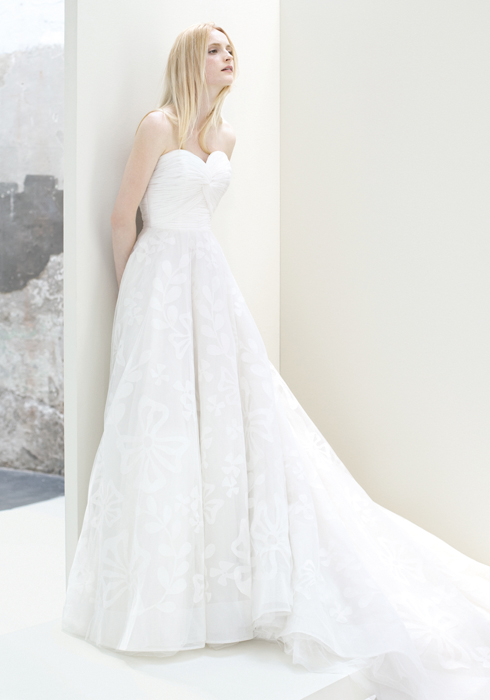오간자 뷔스티에와 꽃 모티브를 수놓은 망사 스커트 Pronovias.