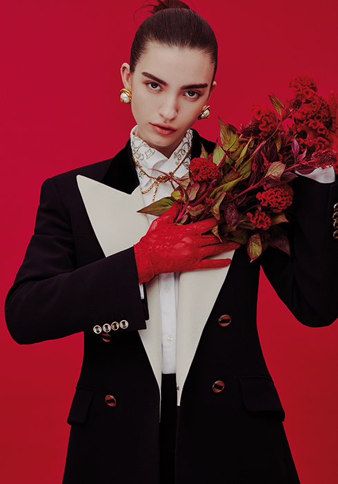과장된 피크트 라펠로 멋을 낸 실크, 울 혼방 소재의 더블브레스트 재킷 6백30만원, 블랙 미니스커트 1백40만원, 레드 컬러 레이스 글러브 48만원, 클래식 무드 글라스 펄 이어링 97만원 모두 구찌. 화려한 비즈 임브로이더리 칼라가 돋보이는 화이트 셔츠 20만원대 폴로 랄프로렌.