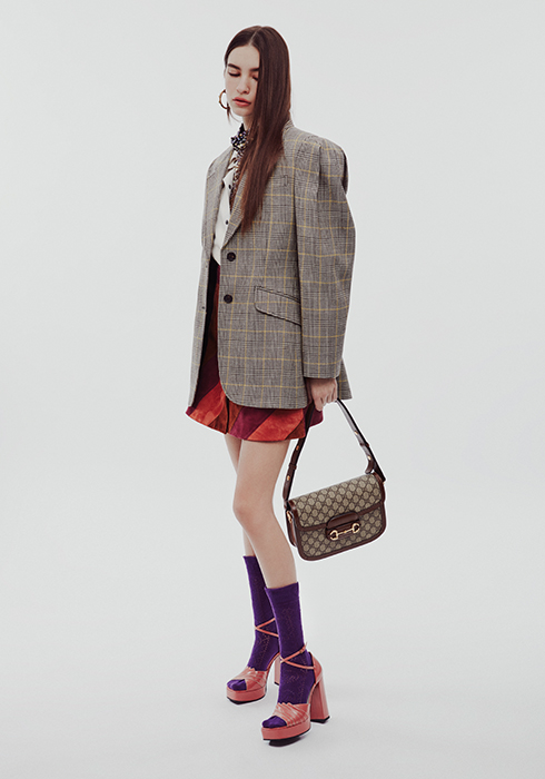 어깨 부분에 플리츠를 더해 입체감을 강조한 오버사이즈 체크 재킷, 컬러풀한 스웨이드를 패치워크한 미니스커트 모두 가격 미정 미우미우. 스팽글 장식 터틀넥 가격 미정 레오나드. 함께 레이어드한 램 스킨 소재 셔츠 1백61만원 롱샴. GG 슈프림 캔버스 소재의 구찌 1955 홀스빗 숄더백 2백73만원, 빈티지한 핑크 레더 소재의 플랫폼 샌들 가격 미정 모두 구찌. 퍼플 삭스 가격 미정 발리. FF 후프 이어링 1백만원 펜디.