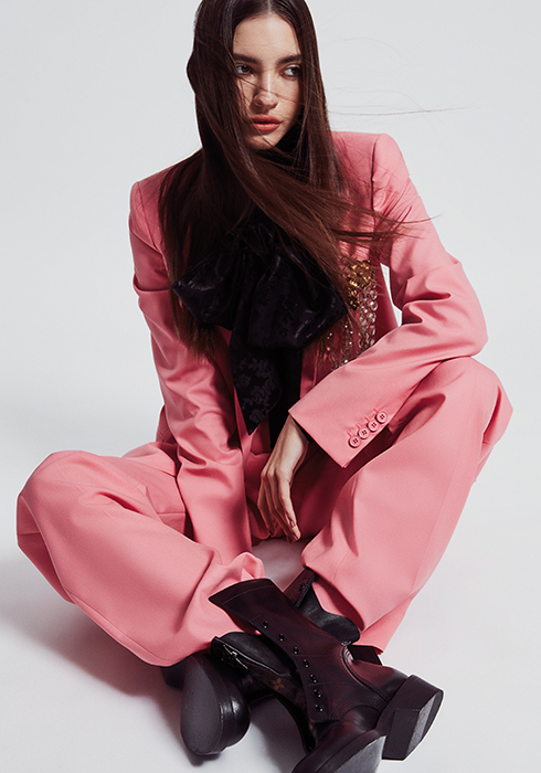 빈티지한 핑크 컬러 더블브레스트 재킷 3백10만원, 매스큘린 핏 트루저 1백20만원, 매듭을 묶어 연출한 블랙 새틴 타이 가격 미정 모두 지방시. 이너로 착용한 블랙 터틀넥 가격 미정 막스마라. 볼드한 플로럴 모티브 골드 브로치 2백60만원 구찌.