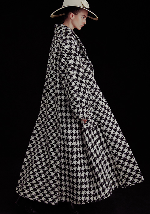 울 트위드 소재의 클래식한 하운즈투스 체크 롱 코트 1천1백85만원 샤넬. 와이드한 새틴 리본을 트리밍한 펠트 햇 1백 34만원 구찌.