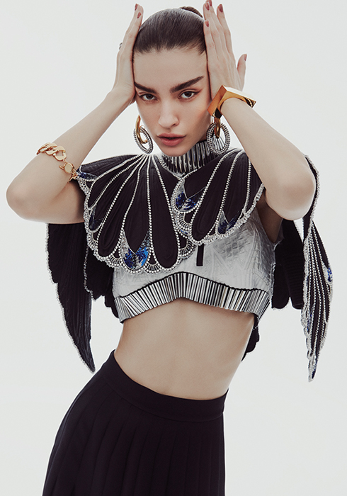 실버 메탈 장식 크롭트 톱, 글래머러스한 크리스털, 시퀸 장식 케이프 모두