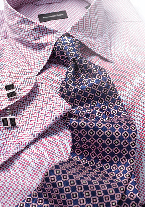 두 가지 이상의 컬러로 이루어진 타이를 선택했다면, 타이를 구성한 컬러 중 하나와 같은 컬러의 셔츠를 선택하는 것이 좋다. 그중 밝은 컬러에 매치하는 것이 더 안전하다. 사진 속 룩은 네이비 바탕에 핑크 컬러 포인트의 타이를 핑크 컬러 패턴의 셔츠와 매치해 화사한 느낌을 살리면서도 세련된 톤온톤 느낌을 자아낸다. 울 소재 패턴 셔츠 59만5천원, 옵티컬 패턴의 실크 타이 27만원, 로듐 도금 메탈 소재 커프스 링크 37만원 모두 에르메네질도 제냐.