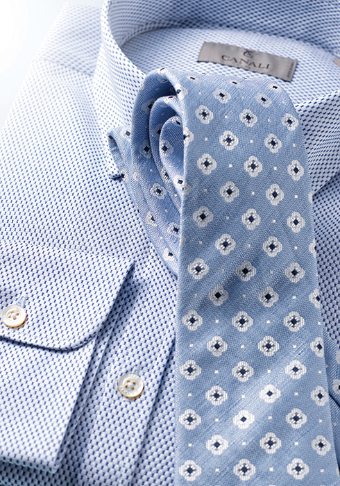 남성들이 화이트 셔츠 다음으로 가장 많이 선택하는 블루 셔츠. 패턴이 있는 셔츠라면 타이도 패턴이 들어간 디자인을 선택하는 것이 좋다. 동일한 컬러가 주는 안정감 덕분에 패턴과 패턴이 더해져도 과하지 않으면서 화사한 느낌을 자아낸다. 블루 코튼 셔츠 53만원, 플라워 프린트 타이 23만원 모두 까날리.