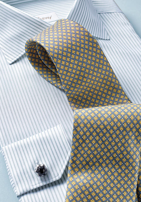 톤온톤 공식과 마찬가지로 남성들이 꼭 기억해야 할 보색 대비! 옅은 그린 컬러 핀스트라이프 패턴 셔츠에 그린이 아닌 옐로 컬러를 더하면 더욱 감각적인 조합을 완성할 수 있다. 핀스트라이프 셔츠 88만원, 패턴 타이 42만원 브리오니. 몽블랑 엠블럼 모티브의 오닉스 커프스 링크 55만원 몽블랑.