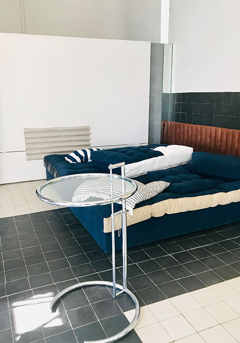 8 E-1027 빌라의 거실 인테리어. ‘캠핑 스타일’을 위한 이동형과 조절식 디자인을 가미했다. 침대 아래 놓인 ‘E-1027 테이블’은 높낮이 조절 가능한 사이드 테이블로 지금도 스테디셀러다.