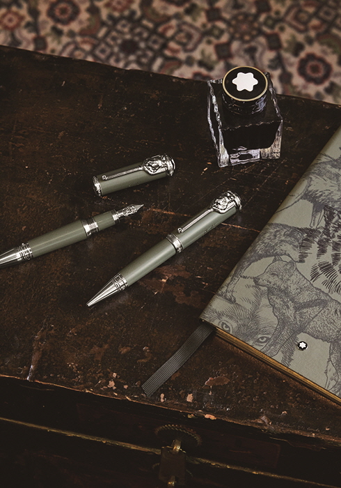 3 작가 러디어드 키플링 에디션 <정글북>으로 널리 사랑받는 조세프 러디어드 키플링(Joseph Rudyard Kipling, 1865~1936)의 재능과 문학적 유산을 기념하는 에디션. 42세에 영어권 작가로는 처음 노벨 문학상을 받으면서 오늘날까지도 최연소 노벨상 수상자로 손꼽히는 그를 위한 이번 리미티드 에디션 펜 중 러디어드 키플링 스페셜 에디션은 정글에서 영감을 받은 카키색 잉크와 늑대 디자인을 프린트한 카키 컬러의 이탈리아 송아지가죽 노트로 이루어졌다. 이외에도 러디어드 키플링 ‘If’ 리미티드 에디션 1895와 러디어드 키플링 리미티드 에디션 70도 함께 선보인다.