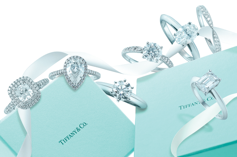 두 줄의 비드 세팅 다이아몬드가 쿠션 컷 다이아몬드를 감싸는 티파니 솔리스트 링, 환상적인 물방울 모양의 페어 셰이프 솔리스트 링, 6개의 프롱이 라운드 브릴리언트 컷 다이아몬드를 완전히 들어 올려 광채가 남다른 티파니 세팅 링, 밴드에  다이아몬드를 세팅해 반짝임을 극대화한 하모니 링, 정교한 커팅의 티파니 오벌 링,티파니 하모니 링을 돋보이게 할 하모니 밴드 링, 소장 가치가 높은 에메랄드 컷 티파니 밴드 링 모두 티파니.