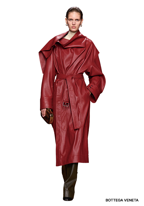 매해 F/W 컬렉션에서 빼놓을 수 없는 요소가 가죽이다. 특히 눈여겨봐야 할 올해 트렌드는 채도 낮은 레드 컬러 가죽. 가죽 자체가 선사하는 도회적 매력과 세련된 분위기가 매력적이며 각 브랜드마다 각각의 시그너처 포인트를 조합해 지루하지 않은 스타일을 연출한 것이 특징이다. 보테가 베네타에서는 차분한 레드 컬러 롱 가죽 코트의 네크라인에 흐트러지는 실루엣으로 포인트를 가미해 여성스러운 분위기를 연출했다. 또 에르메스에서는 보디에 피트되는 실루엣이 돋보이는 미니멀한 디자인이 눈길을 사로잡았다. 이들의 공통점은 다른 아이템의 레이어링을 최대한 자제하고, 가죽 코트 자체의 멋을 돋보이게 했다는 것.