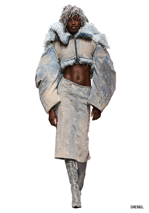 데님에 대한 패션계의 사랑이 계속되는 가운데, 이번 시즌은 데님 소재의 다양성을 탐닉하는 듯 느껴진다. 데님의 메카인 디젤 쇼에서는 데님이 컬렉션 전반에 걸쳐 등장했는데, 데님을 완전히 코팅했다가 크랙 처리한 블랙 코트와 팬츠, 그리고 가죽처럼 코팅한 데님을 통해 변화무쌍하고 흥미로운 변신을 엿볼 수 있었다. 아크네의 데님은 오일 코팅과 금속성 후처리를 거쳐 가죽처럼 보이도록 가공했으며, 블랙 컬러로 오일 코팅 처리한 데님 트래커 재킷은 소매 끝을 살짝 접고 블루 부분을 드러냄으로써 존재감을 부각하는 동시에 어디에서도 볼 수 없는 룩을 선보여 매력적인 변주를 감상할 수 있었다.
