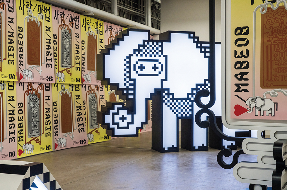 이 모든 작업을 관통하는 M/M(Paris)의 힘은 무엇일까. 이번 전시를 통해 그들은 스스로를 ‘전지전능한 창작자’가 아닌, 기존의 기호와 의미를 엮고 편집하는 ‘열린 구조의 창작자’라고 정의한다. M/M(Paris)의 힘은 바로 이 지점에서 나온다. 이들은 먼저 자신들만의 알파벳을 만들고, 이를 해체하고 재조합하며(고려제강의 심벌 ‘코끼리’와 M/M(Paris)의 상징적 캐릭터 ‘The Agent’가 합쳐져 ‘ElephAgent’가 되듯) 하나의 거대한 기호 생태계를 구축한다. 이번 전시의 키워드인 ‘마법(MAGIE)’을 ‘IMAGE’, ‘MAGI’, ‘NATION’으로 해체해 ‘IMAGINATION’과 연결하는 유쾌한 언어유희가 대표적이다. 이번 전시에서 ‘마법’이란 이미지를 통해 현실과 상상을 넘나들게 하는 새로운 인식을 창조하는 능력이다. 그리고 그 결과물을 해석의 여지가 있는 질문의 형태로 제시함으로써 관객을 단순한 구경꾼이 아닌 능동적인 참여자로 초대한다.