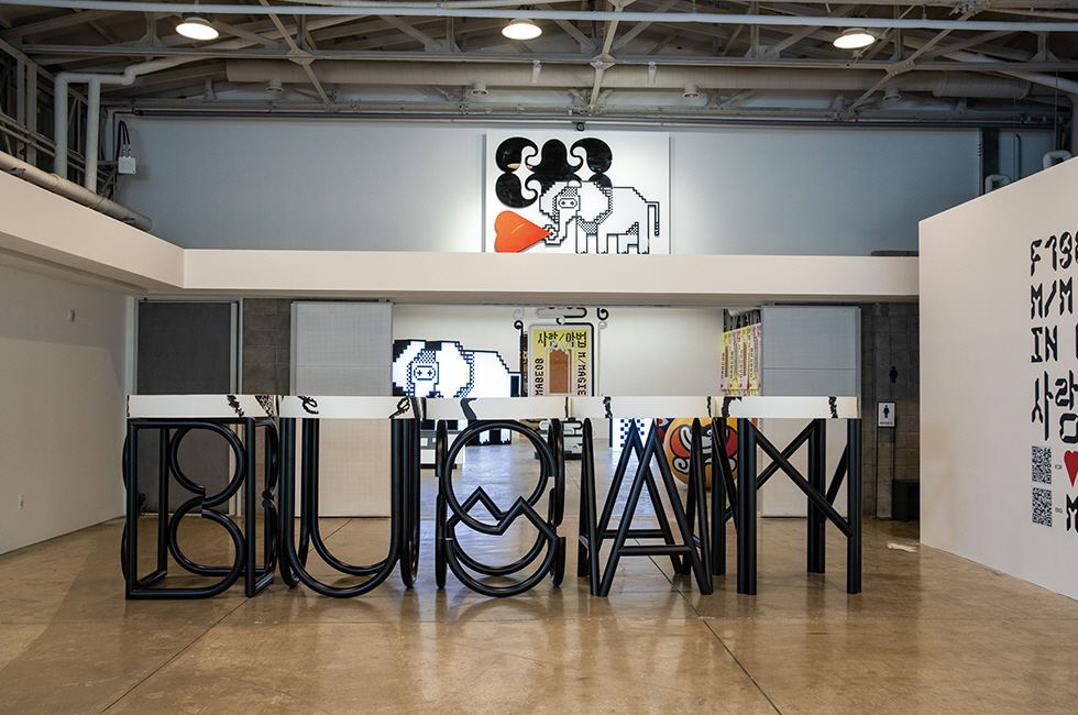 1992년 파리, 미카엘 암잘라그(Michaël Amzalag)와 마티아스 오귀스티니아크(Mathias Augustyniak)가 M/M(Paris)를 창립했을 때만 해도 그래픽디자인은 예술의 하위 범주 또는 클라이언트를 위한 상업적 서비스라는 인식이 짙었다. 그로부터 30여 년이 흐른 지금, 부산 망미동의 복합 문화 공간 F1963에서 진행 중인 M/M(Paris)의 전시 〈사랑/마법 ♥/MABEOB M/MAGIE〉은 그동안 디자인의 위상이 어떻게 변했는지, 그리고 그들 자신이 어떻게 한 시대의 문화 지형도를 바꾼 창조자로 자리매김했는지 보여준다. 2017년 겨울에 열린 서울 전시 이후 7년 만에 한국을 다시 찾은 이들의 첫 부산 전시다. 오는 9월 14일까지.