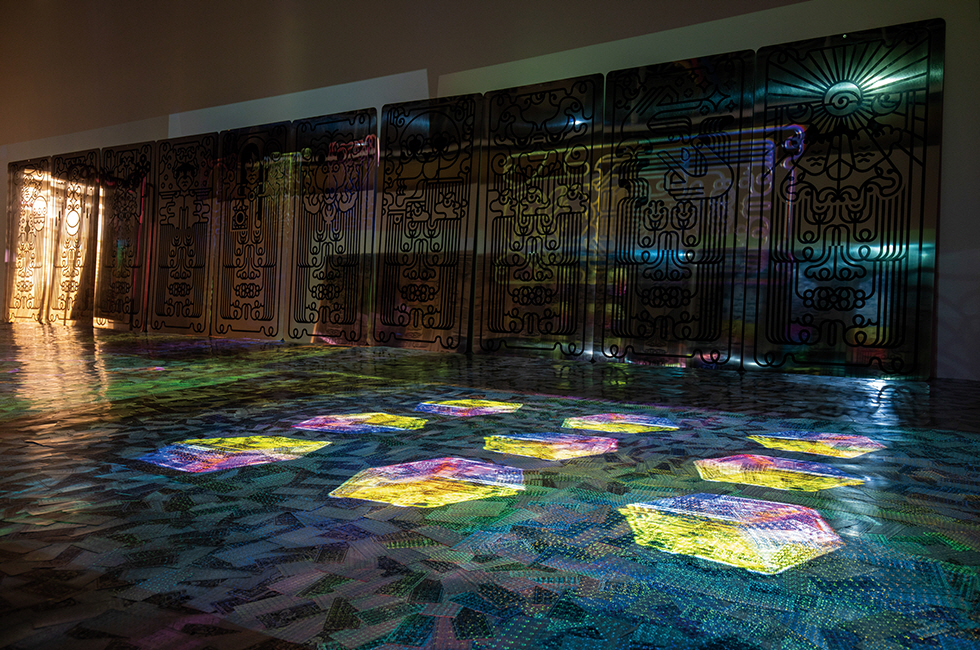 4 부산 F1963 전시장 바닥에 쌓여 있는 홀로그램 카드는 작가들이 부산 바다 수면에서 영감을 받았다.