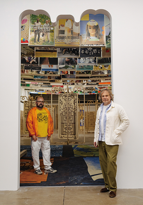 1 부산 F1963 전시장에서 타로 카드 오브제와 포스터를 배경으로 서 있는 미카엘 암잘라그와 마티아스 오귀스티니아크.