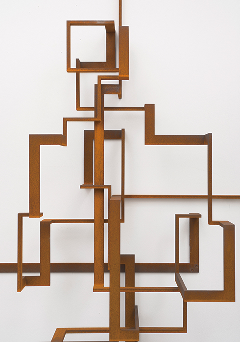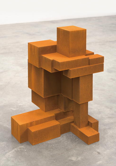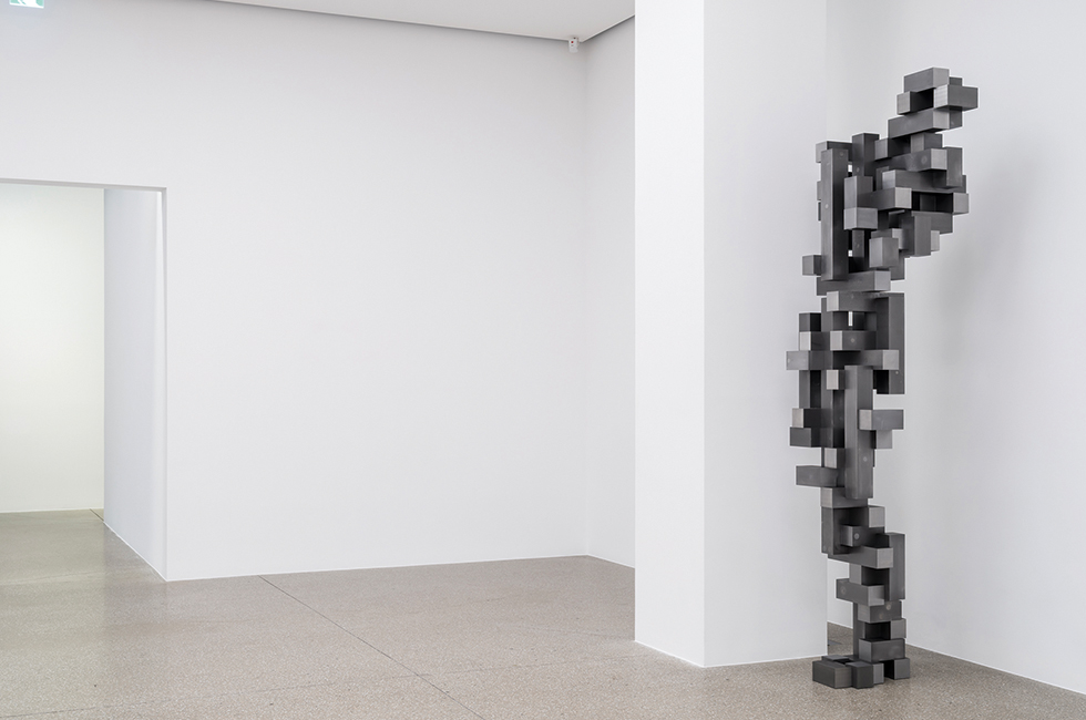 전시를 관통하는 주제인 ‘인간과 공간의 관계’와 관련해 곰리의 작업은 크게 세 단계로 살펴볼 수 있다. 첫 번째, ‘동물적 본성’과 관련해서는 그의 최근 작업보다 이전 작품인 ‘Birth’(iron, 0.8×2.3×0.7m, 통영 남망산 조각공원, 1997)에서 더 직접적으로 드러난다. 이 작품은 ‘보디 케이스(Body Case)’라고도 불리는데, 작가가 자신의 몸을 석고로 캐스팅해 만든 조각이다. 주물 석고에 갇히는 숨 막힘, 세상과의 단절, 산 채로 미라가 되는 듯한 공포가 동물적 감각을 극대화한다. 그는 이 공포를 인도에서 배운 명상으로 극복했으며, 이는 외부와의 관계로 확장시키는 계기가 된다. 두 번째, ‘Block Works’ 작업에서는 곰리가 ‘물리적 픽셀’이라 부르는 ‘블록(block)’이 주 구성 요소다. 이는 단순한 조형 단위가 아니라, 문명의 기초 단위인 벽돌을 연상시키며, 몸과 건축, 도시를 잇는 개체로 작동한다. 블록으로 구축된 신체는 곡선적 유기체가 아니라 적층된 구조물로 드러나며, 인간이라는 존재가 도시와 건축에서 어떻게 해체되고 재구성되는지 보여준다. 곰리는 인류의 절반 이상이 도시에 거주하는 오늘날, 도시가 인간에게 부여하는 자유와 제약을 동시에 시각화한다. 세 번째는 ‘Extended Strapworks’ 연작이다. 철제 띠로 구축된 신체는 내부가 비워지고 외부와 투과적으로 연결된다. 고정된 육체가 아니라 공간적 궤적처럼 제시되며, 몸은 건축적, 도시적 환경과 불가분의 관계에 놓인다. 이는 신체가 실체라기보다 관계와 흐름으로 이뤄진 열린 구조임을 드러낸다. 곰리의 작업은 점차 신체가 공간화, 공(空)화되는 과정을 통해 변화된 인간 조건을 탐구한다.