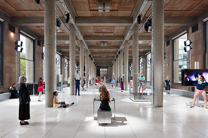 2, 3 프랑스 경제사회환경위원회의 본부이자 미우미우 런웨이 쇼 장소이기도 한 팔레 디에나에서 특별 프로젝트인 를 선보였는데(10월 16일~20일), 아티스트 고쉬카 마추가(Goshka Macuga)가 구상하고 바르셀로나 현대미술관(MACBA) 관장인 엘비라 디앙가니 오세(Elvira Dyangani Ose)가 기획을 맡은 행사다. 여성이 자신의 이야기를 주체적으로 풀어놓는 미우미우의 단편 영화 ‘우먼스 테일’ 시리즈 등에서 등장했던 다양한 캐릭터들이 실제로 나와 ‘퍼포먼스’를 펼쳐 패션과 여성, 예술을 창의적으로 버무려내는 경험을 선사했다. Courtesy of MIu Miu