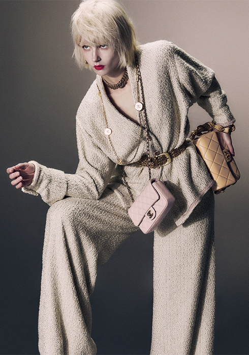 이리데슨트 캐시미어 트위드 소재 재킷과 팬츠, 메탈 & 레진 소재의 체인 벨트, 메탈 소재의 이어링, 초커, 네크리스, 핑크 컬러 램 스킨 & 골드 톤 메탈 플랩 백, 베이지 컬러 램 스킨 & 골드 톤 메탈 플랩 백 모두 가격 미정 샤넬.