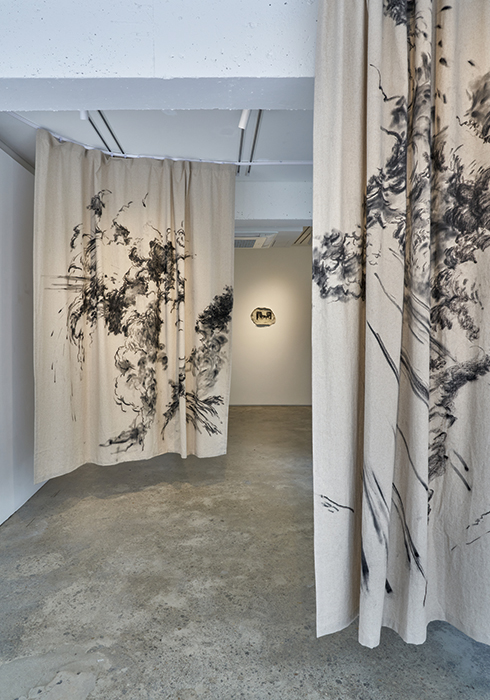1 ‘소음의 팽창’, 가변 설치, 천 위에 목탄, 2025. 벽에 걸려 있는 작품은 ‘아주 짧은 산책길에 본 얼룩들’(2022).