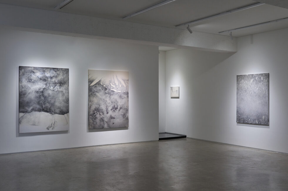 (왼쪽부터) ‘녹은 물과 고랑’, 145.5×112.1cm, 한지에 모래와 호분, 2025. ‘아침에 뜬 겨울’, 145.5×112.1cm, 한지에 모래와 먹, 호분, 2025. ‘흰 막이 닿는 자리’, 116.8×91cm, 한지에 모래와 호분, 2025.